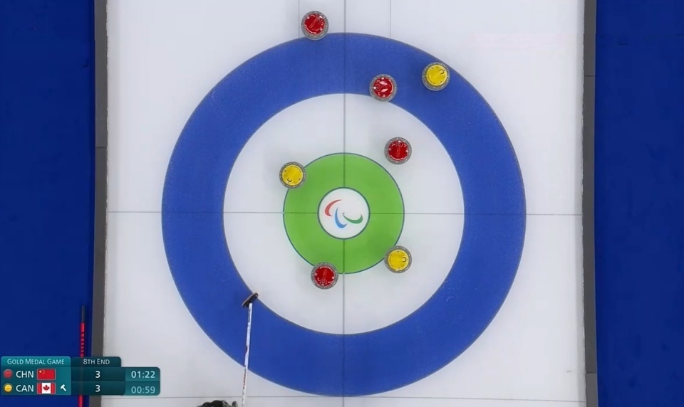 但因为无法判断绿圈左上加拿大黄壶和左下中国红壶的位置远近,所以伊德森还是要投最后一壶,尽量将黄壶推近一些。