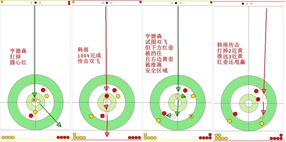 亨德森的粘磕被韩雨双飞打掉,亨德森第二投刚好压在7区边上,韩雨投壶力量大了,以至于苏亭毓姜嘉怡几乎没有擦冰,万幸最后红壶险胜黄壶,中国拿到关键1分。
