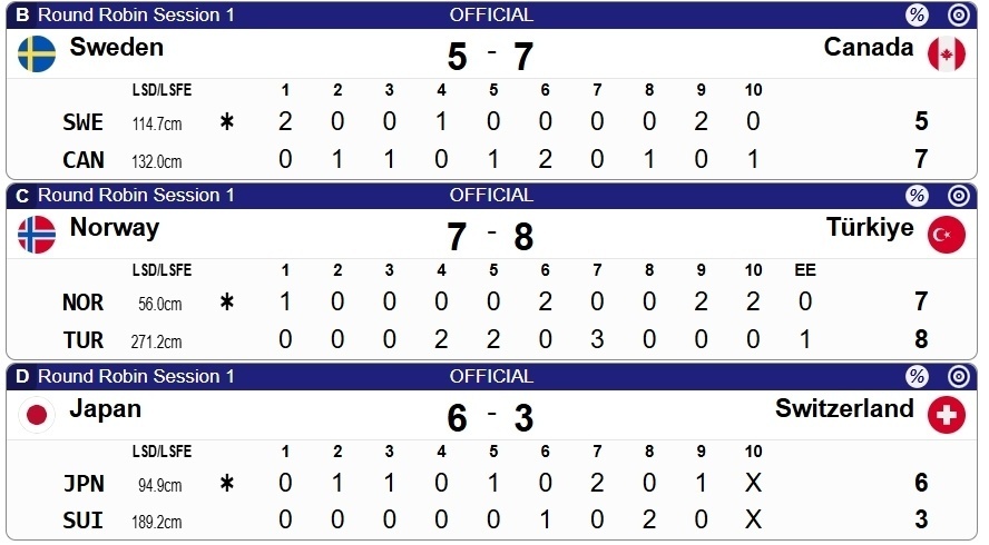 另外三场对局里,除开瑞典5-7不敌加拿大在意料之中,另外两场都爆出冷门,分别是挪威7-8不敌土耳其,日本更是6-3逼瑞士提前一局握手!