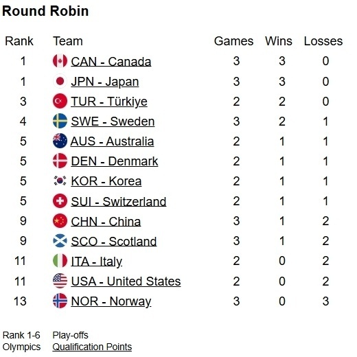 目前中国队1胜2负,排名跌至第九;加拿大和日本并列排在第一之外,接连战胜苏格兰和挪威的土耳其居然排在第三,这是目前最大冷门。