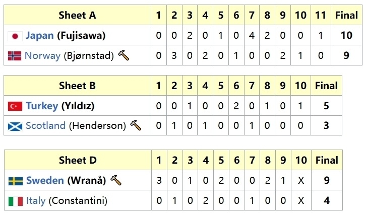 另外三场对决里,日本10-9挪威、土耳其5-3苏格兰、瑞典9-4意大利。