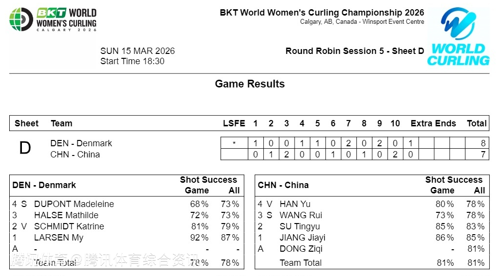 中国队虽然在第十局凭借精彩的最后两投扳平比分将比赛拖入加局,并且在加局对手最后一投前布下好局,无奈丹麦四垒杜邦打出精彩传击破局。