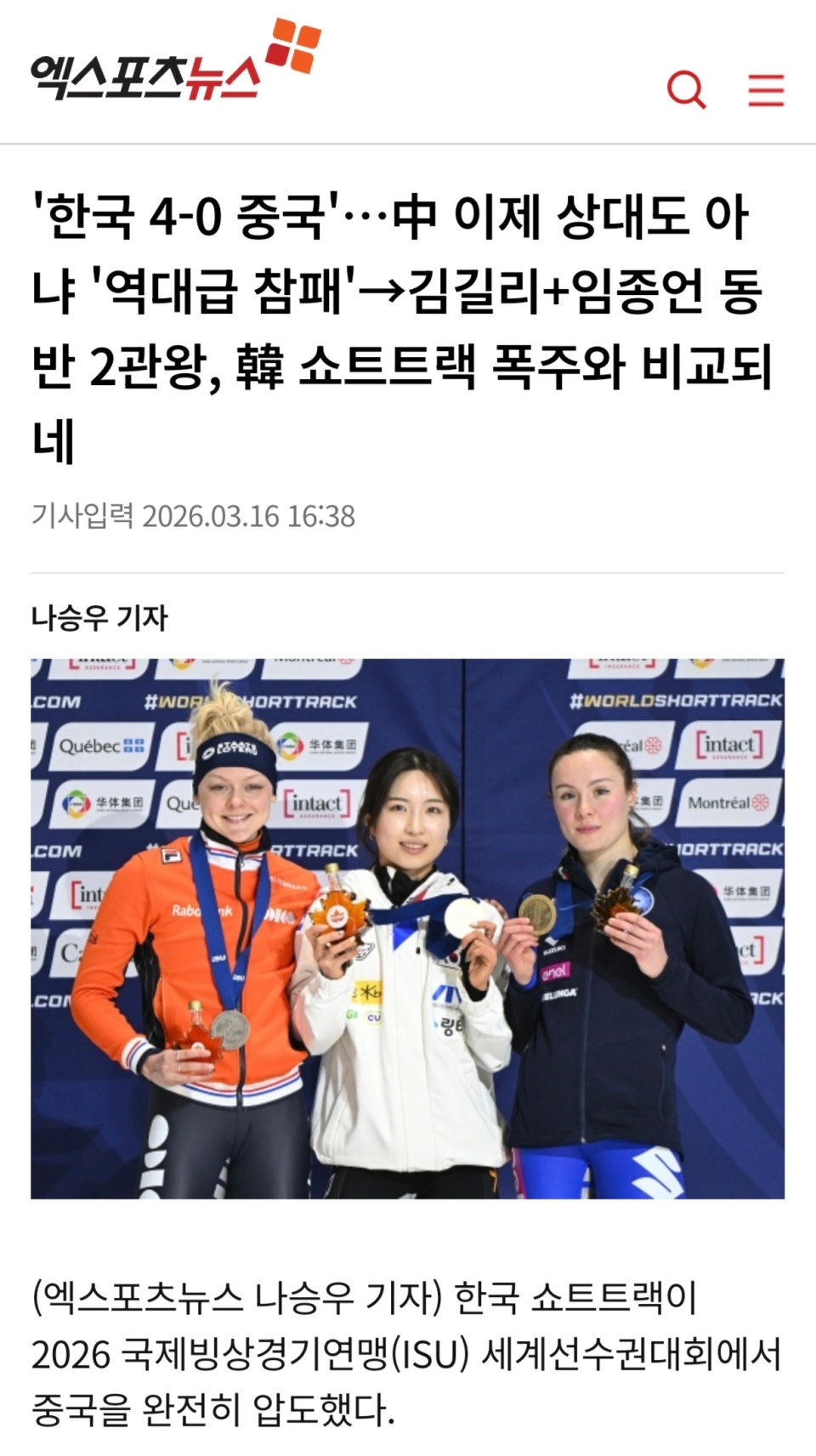 在加拿大蒙特利尔结束的2026年短道速滑世锦赛上,韩国队共斩获4 枚金牌。新生代王牌选手金吉莉与林钟彦双双加冕双冠王,尽管没有银牌和铜牌,但依旧以4金高居奖牌榜首位。荷兰队以2金5银紧随其后,东道主加拿大队仅收获 2 金。反观中国队,本届世锦赛不仅一枚金牌未得,就连个人项目也无缘奖牌,给短道速滑爱好者带来巨大冲击。