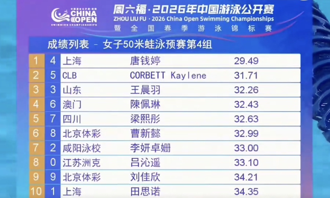 北京时间3月19日,2026年中国游泳公开赛在深圳龙岗大运中心游泳馆开赛。女子50米蛙泳预赛,唐钱婷以29秒49的成绩刷新由她自己保持的亚洲纪录,以预赛头名晋级A组决赛。张雨霏32秒27,排名第11晋级B组决赛。