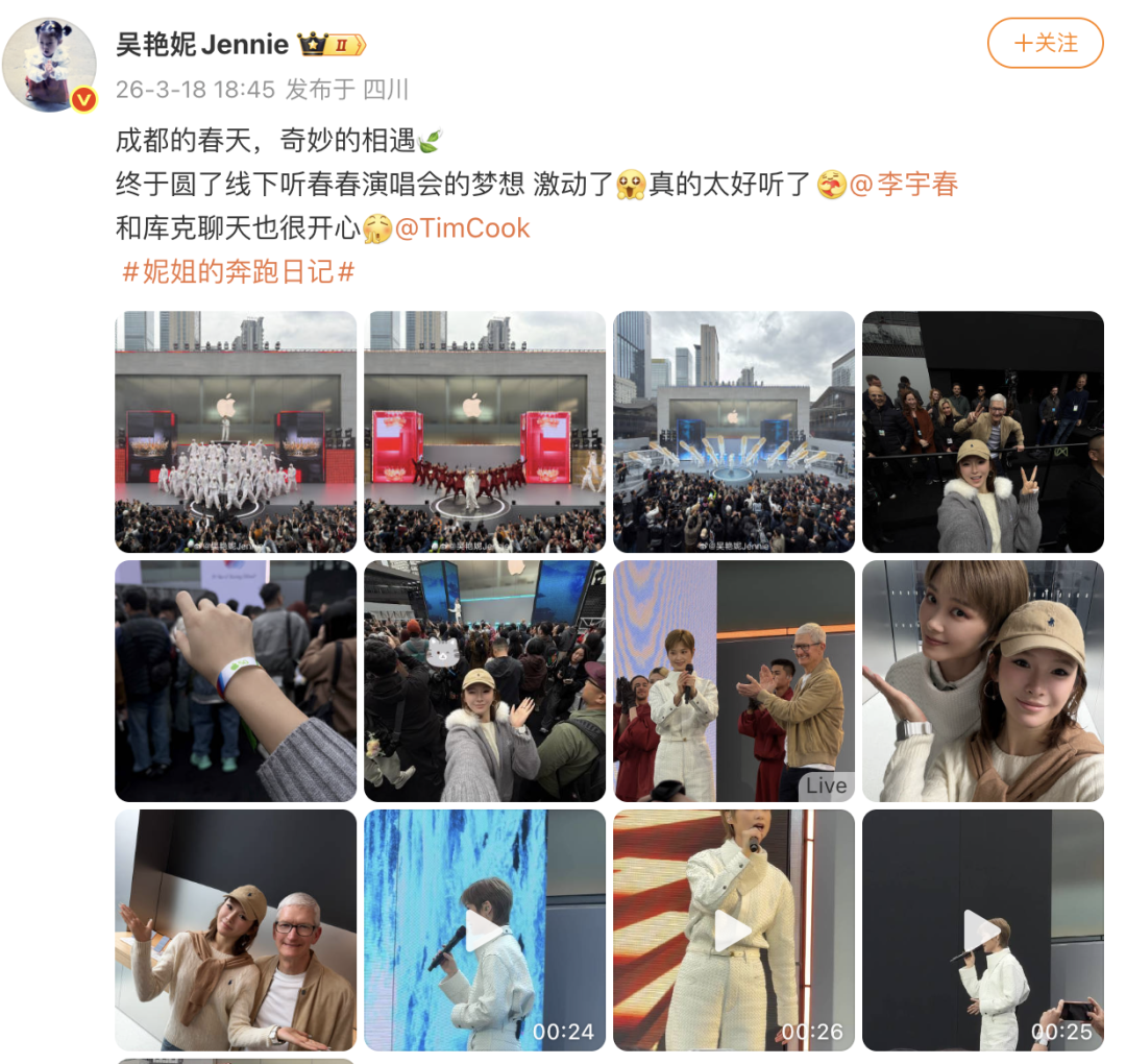 吴艳妮在微博写道:"成都的春天,奇妙的相遇。终于圆了线下听春春演唱会的梦想,激动了真的太好听了。和库克聊天也很开心。"从她发布的多张现场照片来看,这位跨栏名将不仅在Apple Store内与库克面对面合影,还在活动间隙与李宇春拥抱寒暄、自拍留念,并在观众区近距离欣赏了李宇春的户外演唱会。