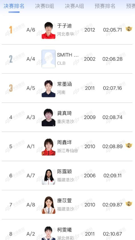 预赛美国选手、巴黎奥运会该项目银牌得主丽根-史密斯以2分08秒71的成绩排名第1位。11年出生的小将常墨涵2分09秒79排名第2位,13岁的小孩姐于子迪预赛游出2分11秒09的成绩,排名第4位晋级。