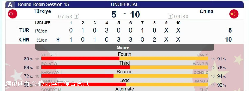 本场比赛第六局成为转折点,韩雨虽在3月19日对阵瑞典时膝盖磕伤,但经调整后火线复出,本场旋球成功率达96%,贡献关键双飞清除对手占位壶,迫使土耳其四垒出现严重失误,中国队趁机偷得3分。随后第八局土耳其提前认输。