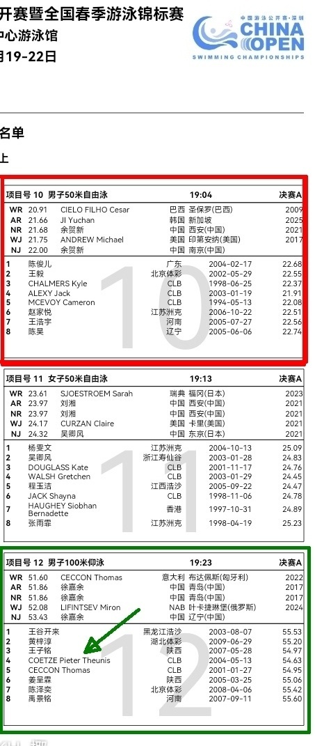 2026中国游泳公开赛即将进入第二个比赛日的决赛较量:从最新的决赛秩序单来看,南非名将科策退出了50米自由泳决赛,从而力保主项100米仰泳,全力向1万美元奖金发起冲击。