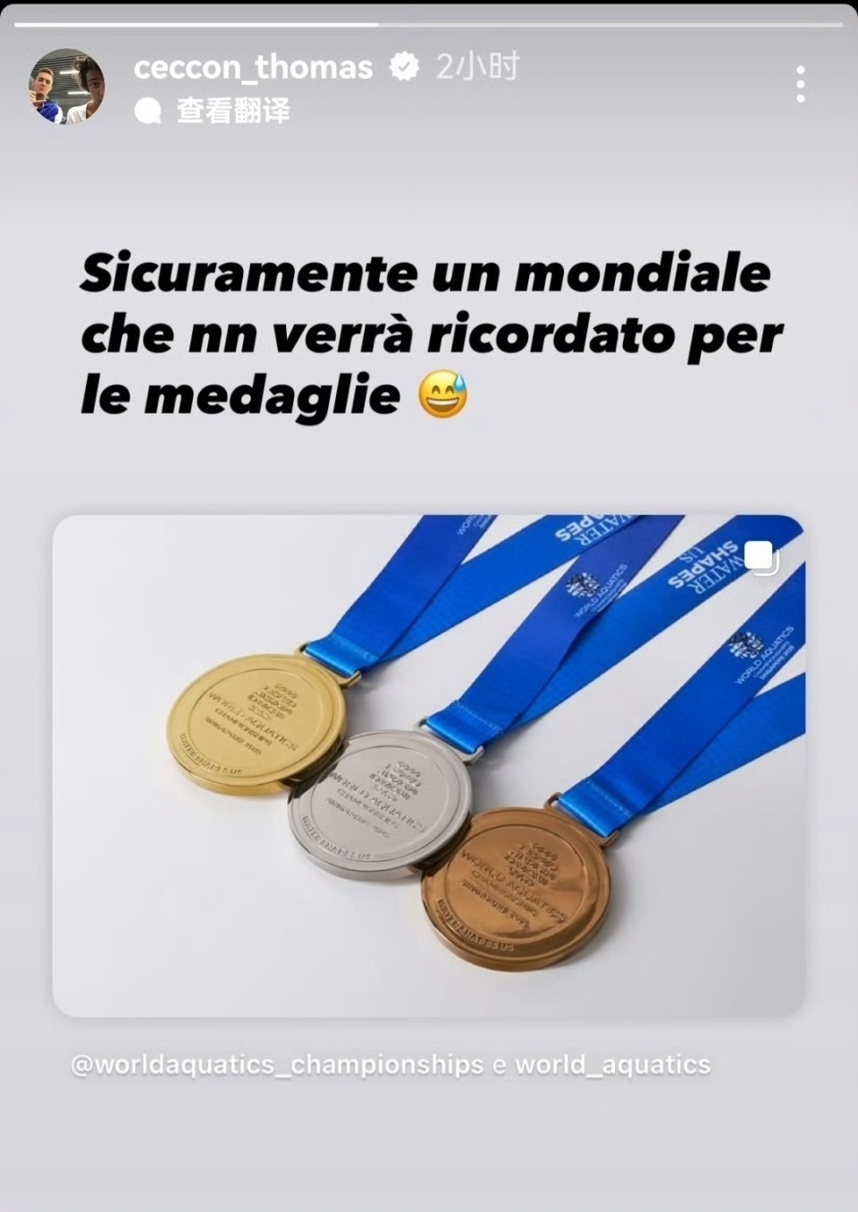 正在参加首届中国游泳公开赛的意大利名将切孔,在个人社交媒体上秀出了50米仰泳银牌,并特意@世界泳联,看样子是让世界泳联好好学学优秀的奖牌设计。