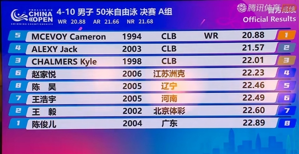 就这样,2009年由巴西名将小西埃洛在2009年游出了20秒91,保持了16年的50米自由泳纪录,就在首届中国公开赛上被麦克沃伊打破了!