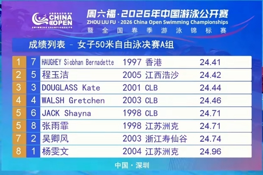 不过中国选手程玉洁以24秒47排在第二,中国香港选手何诗蓓以24秒89排名第六。