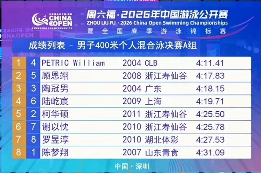最终,佩特里克以4分11秒41夺冠,顾恩翊以4分17秒83摘银,陶冠男4分18秒15收获铜牌。