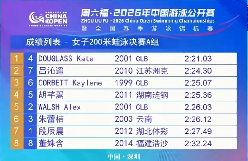 第三个转身时,道格拉斯已经领先2.69,秒,擅长后程的吕沁遥冲到第二。最终,道格拉斯2分21秒03夺冠,吕沁遥2分24秒30摘银,柯尔贝特2分25秒07第三。