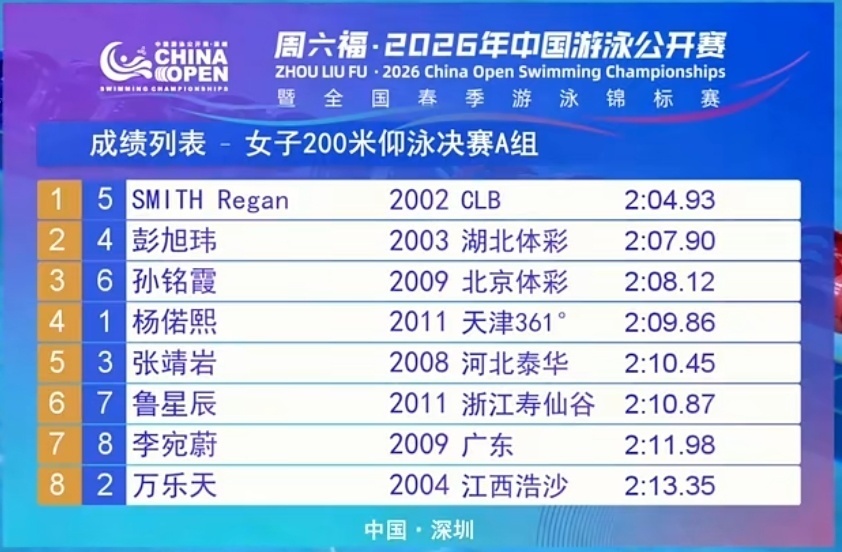 史密斯出发反应0.56,前50领先彭旭玮0.65,第二段差距拉到1秒41,将近1个身位;第三个转身领先了2.36秒!最后50米划水频率依然没有下降,以2分4秒93夺冠。
