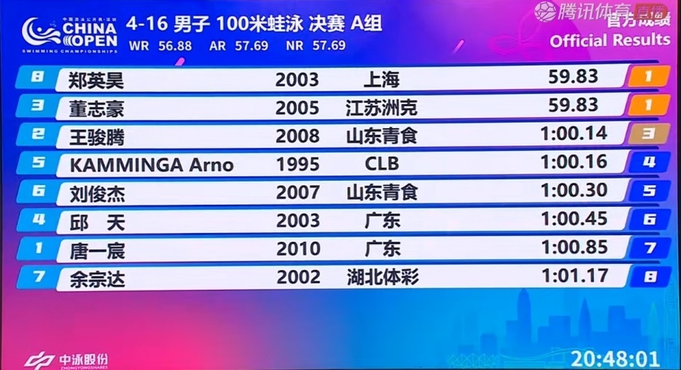 到了决赛,前50拼抢非常激烈,有6名选手几乎同时转身,直到最后20米也没有分出来胜负,结果郑英昊和董志豪以59秒83并列第一,王骏腾排在第三,卡明嘉1分00秒16排在第四。