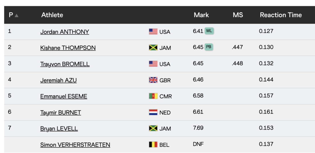 45分钟后的决赛,安东尼更进一步。他凭借闪电般的起跑反应迅速建立领先,全程保持强势节奏,以6秒41一路丝滑冲线,将半决赛刚刚刷新的PB再降0.02秒。身后三人几乎同时撞线,奖牌争夺持续到千分位——汤普森6秒45(.449)力压布罗梅尔6秒45(.450),以0.001秒的微弱优势拿下银牌。