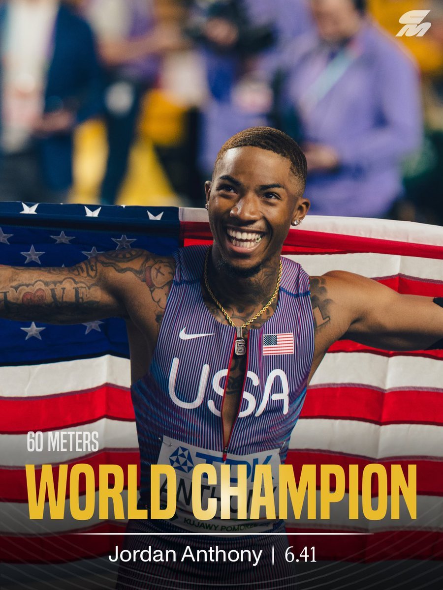 北京时间3月21日凌晨,2026年世界田联室内田径锦标赛在波兰托伦继续进行。男子60米决赛,21岁美国新星乔丹·安东尼(Jordan Anthony)以6秒41强势夺冠,刷新本赛季世界最好成绩和个人PB,生涯首次参加世锦赛级别大赛即登顶。