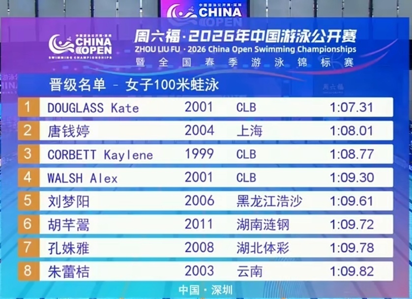 共有3位外协选手参赛—二组的阿历克斯.沃尔什明显收着游,以1分09秒30位列小组第一。