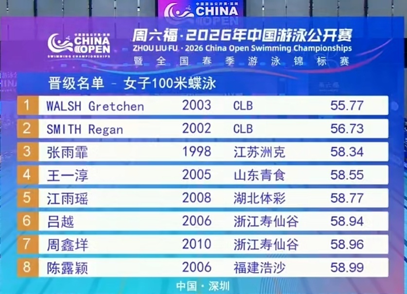 史密斯在六组,出发反应0.67,前50她没有游出来,但还是以27秒26第一个转身,领先浙江选手吕越0.09;后半程相当稳健—她的技术和中国选手明显不同,以56秒73排在第一。