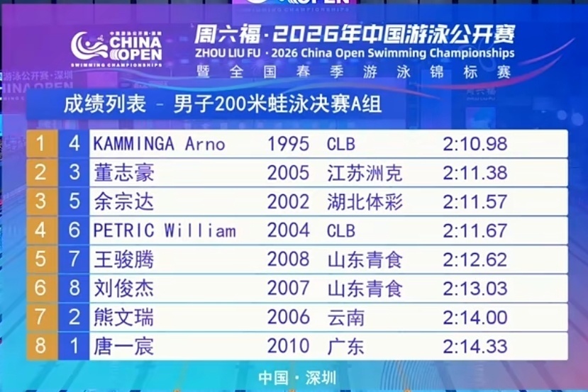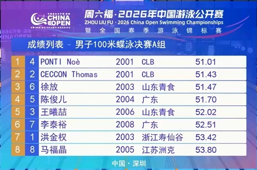 共有5位外协选手参赛,但切孔选择退赛:阿莱克西第一,潘展乐第二,之后是查尔莫斯和科策。