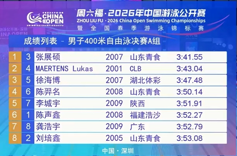 中国选手方面,最大惊喜则是张展硕力压世界冠军马尔滕斯,以3分41秒55刷破世界青年纪录,继200和1500之后,收获第三枚金牌。于子迪、唐钱婷也收获冠军,潘展乐则在男子100自大战中摘铜。