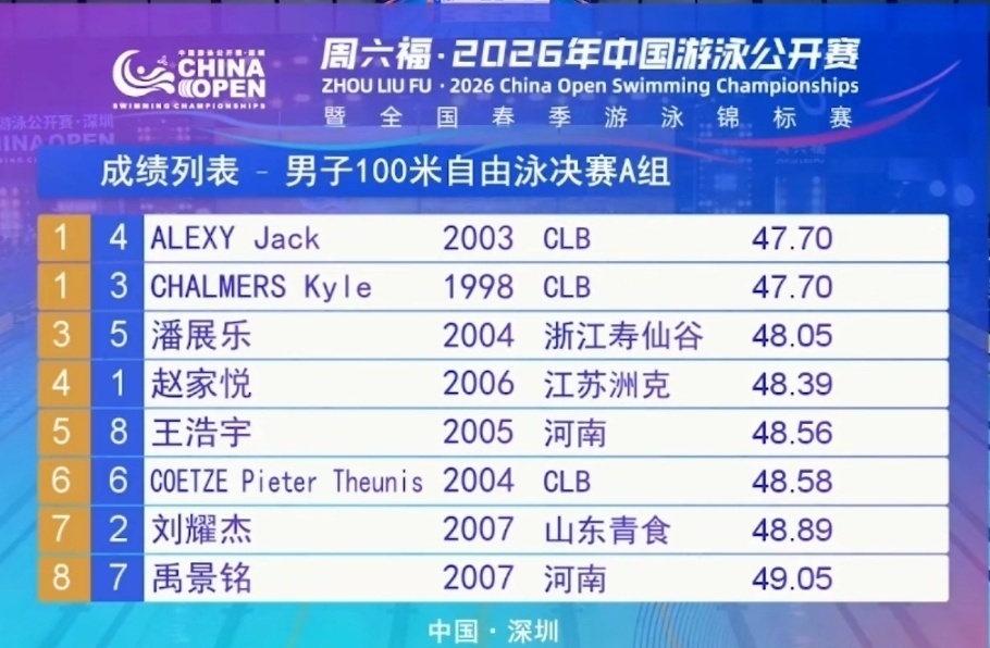 后半程潘展乐和查尔莫斯开始加速,最终查尔莫斯和阿莱克西都游出47秒70并列第一,潘展乐第三。