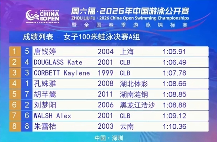 值得一提的是,道格拉斯是昨天200蛙冠军,唐钱婷是前天50蛙冠军,最终在这场遭遇战中,是50赢了200。