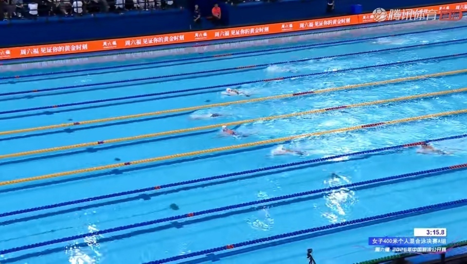 蛙泳段余依婷游的很轻,可转身后被柯雯曦追平;