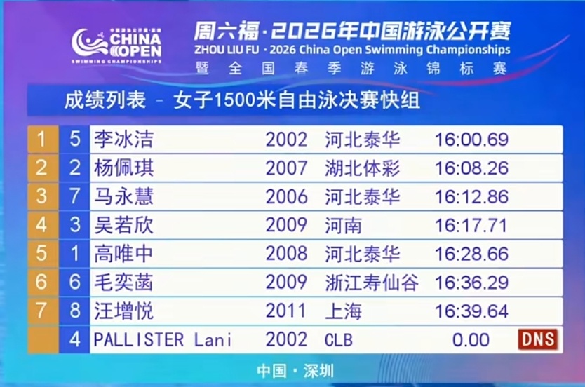 最终,李冰洁以16分00秒69,继第一个比赛日的800之后,再收一枚金牌,杨佩琪摘银,马永慧第三。