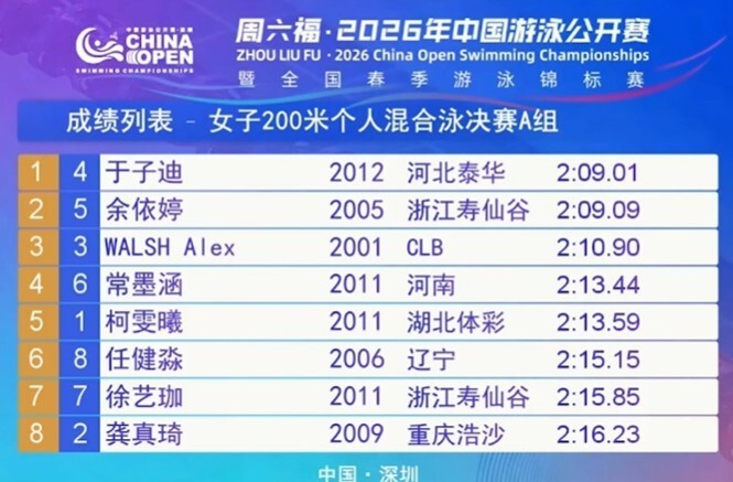 预赛小孩姐于子迪游出2分12秒66的成绩,是所有选手唯一一位游进2分13秒之内的选手。余依婷以2分13秒90的成绩,排名第2位晋级。阿莱克斯-沃尔什和道格拉斯两位外籍名将,分别以第3和第4名的成绩进入决赛。