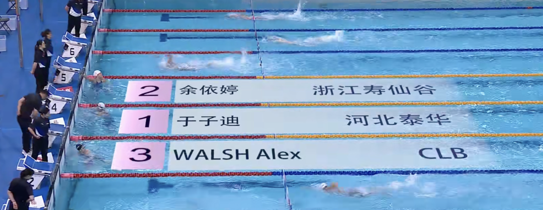 这场决赛的过程跌宕起伏。前50米蝶泳阶段余依婷率先抢到领先位置,于子迪排名第三。进入仰泳阶段后,余依婷继续扩大优势,100米转身时于子迪落后约0.88秒。蛙泳阶段余依婷依然保持领先,于子迪和沃尔什紧随其后形成第二集团。转折出现在最后的自由泳冲刺——于子迪全力加速,在终点前完成了对余依婷的超越,率先触壁。