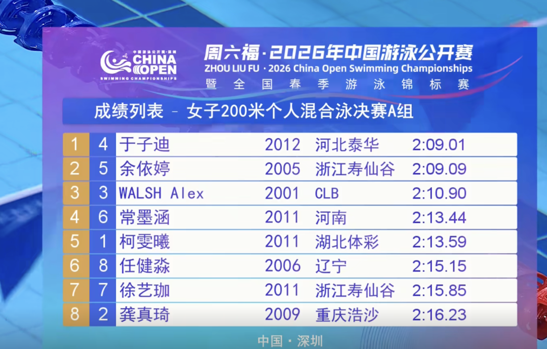 3月22日晚,2026年中国游泳公开赛暨全国春季游泳锦标赛收官日在深圳大运中心游泳馆进行。女子200米个人混合泳决赛,亚洲纪录保持者于子迪在最后50米自由泳冲刺阶段完成绝杀反超,以2分09秒01力压余依婷的2分09秒09夺冠,0.08秒的微弱优势锁定了她在本届赛事的第三枚金牌。美国名将阿莱克斯·沃尔什以2分10秒90摘铜。