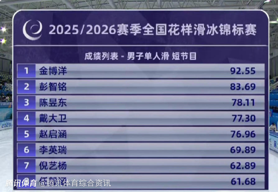 北京时间12月26日,2025-2026赛季全国花样滑冰锦标赛男单短节目比拼结束,金博洋完成动作包括 4T(落冰翻身)、3A(阿克塞尔三周)、3Lz+3T(勾手三周接后外点冰三周),技术分(TES)49.06 + 节目内容分(PCS)44.49,因超时扣1分,最终得分92.55分,暂列第一,彭智铭排名第二,陈昱东排名第三。