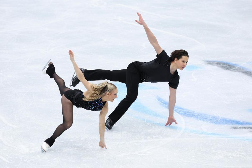 以“辣妹”舞曲集锦为伴奏的英国搭档费尔/吉布森,开场中线步手臂动作运用可谓典范;折回图形的连续捻转步很干净;规定图形的路线与其他选手明显不同,编排步伐的手拉手舞蹈如影随形,最后的旋转托举有重心和姿态变化,85.09(48.46/36.63)略低于米兰冬奥会。