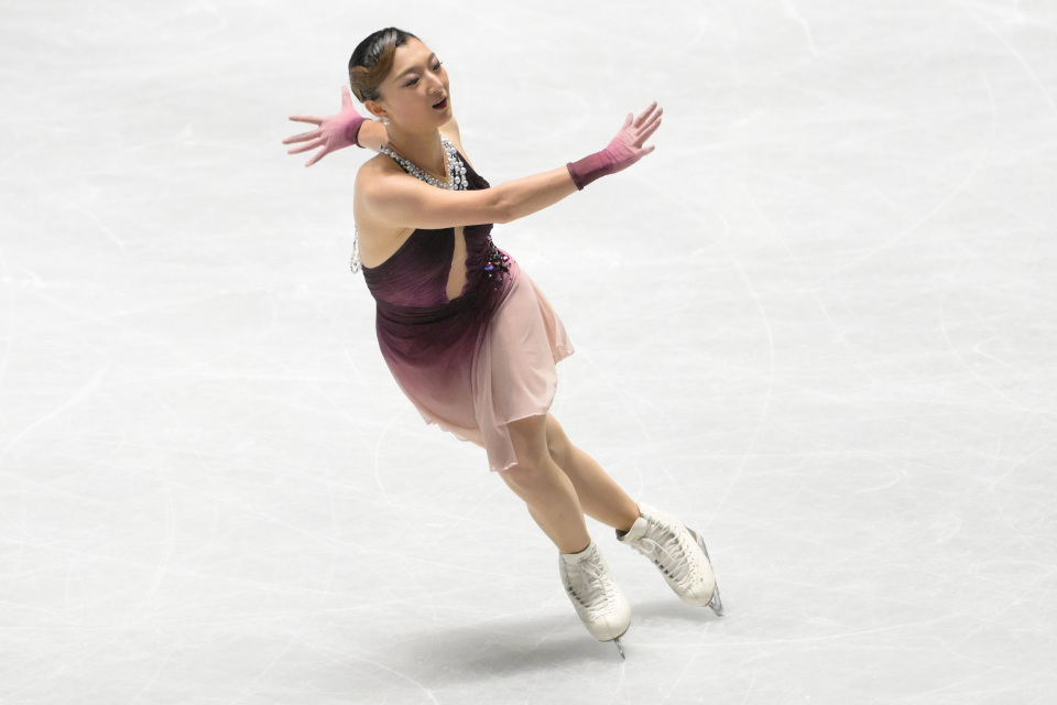 最后出场的坂本花织以《玫瑰人生》《爱的赞歌》《我不后悔》这三首法国香颂为伴奏:阿克塞尔两周落在重音上,转体衔接与音乐起伏结合天衣无缝,后内点冰三周从短轴进入,勾手三周接两周也是轻松感十足。