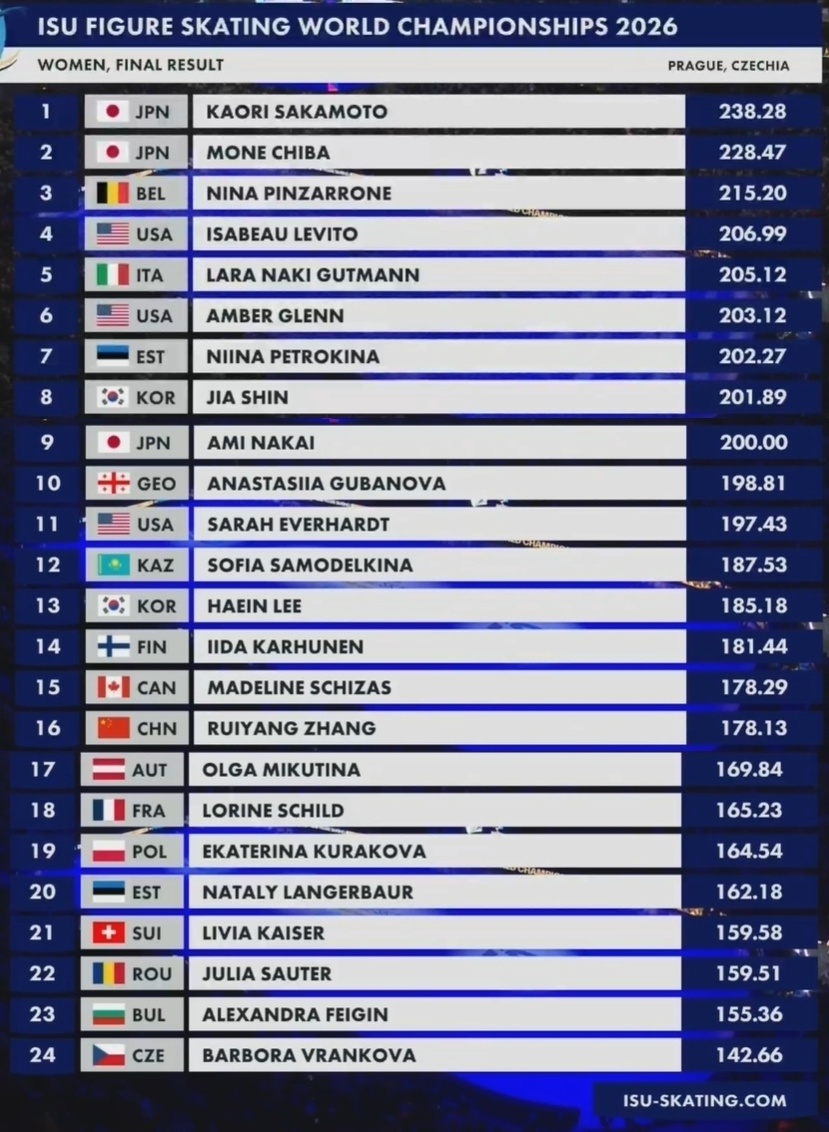2026花滑世锦赛在捷克-布拉格结束女单自由滑的比拼:坂本花织以238.28第四次问鼎,千叶百音以228.47收获银牌;两人的成绩也比米兰冬奥会冠军、美国名将艾丽莎的226.79都要高!