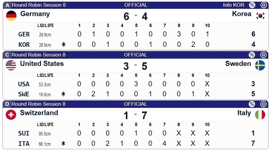 另外三场较量里,德国6-4韩国、美国3-5瑞典、瑞士1-7意大利。