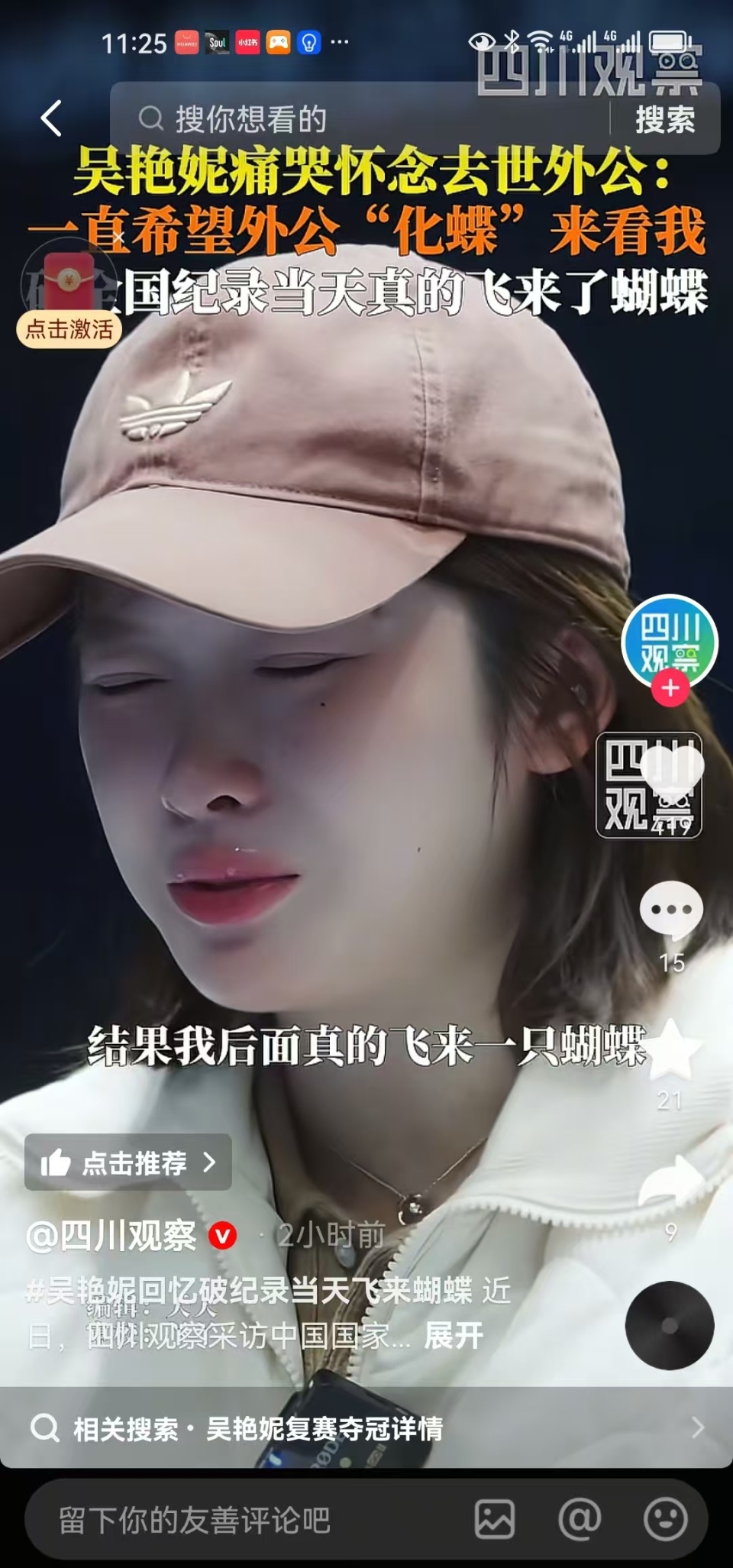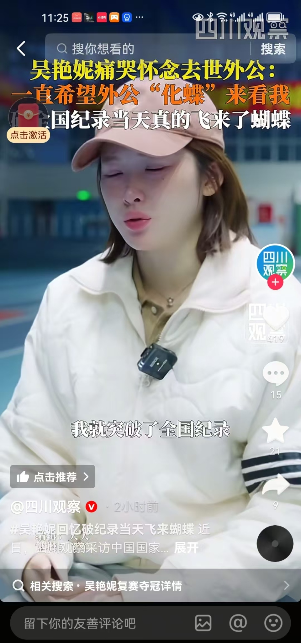 吴艳妮说,在外公去世前自己没有那么渴望拿到金牌。她说:“(刚练田径时)每次回家外公都说,我就相信你以后肯定能拿全国冠军,你以后肯定就是冠军。”她表示,外公去世,让她真正感受到人会一夜之间长大。吴艳妮哭着说:“我比南京室内赛的时候,我也希望外公能化成蝴蝶来看我比赛。在比预赛的时候,我穿完跑鞋在那里站着,我想过一栏,结果后面真的飞来一只蝴蝶。当天晚上的复赛,我就突破了全国纪录。”
