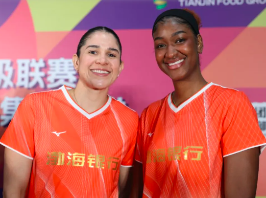 天津渤海银行女排巴西主攻娜塔莉亚和多米尼加副攻小马丁内斯