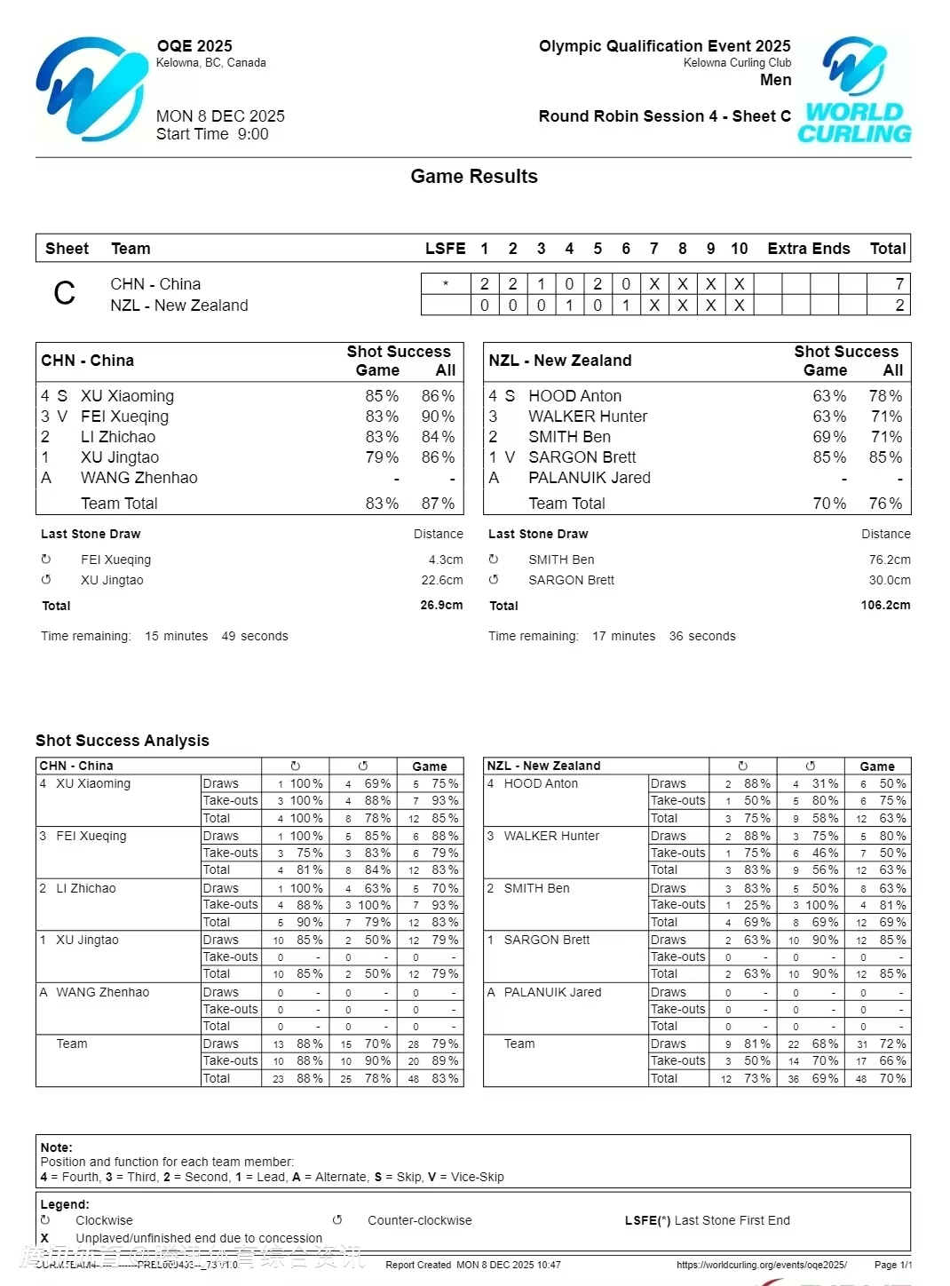 北京时间12月9日,在加拿大基洛纳进行的冰壶奥运落选赛中,中国男队在第四场7-2大胜新西兰,迫使对手在第七局就早早握手。