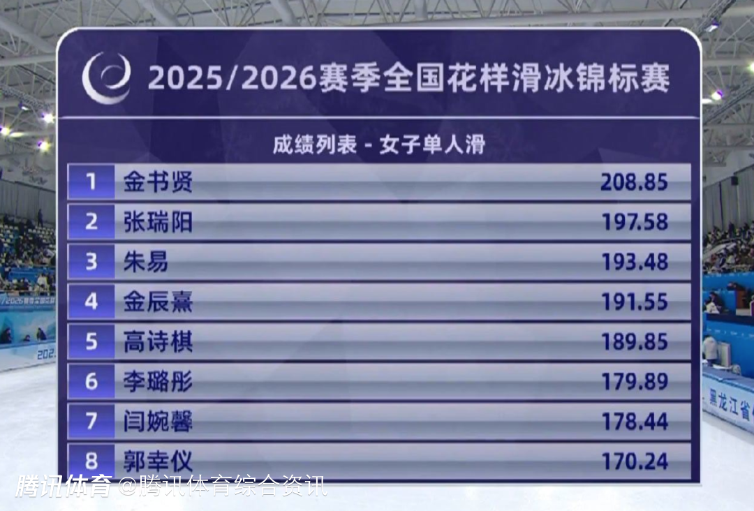 北京时间12月28日,全国花样滑冰锦标赛女单自由滑决赛,金书贤得到139.77分,总得分208.85分,拿到冠军,张瑞阳197.58分获得亚军,朱易193.48分获得季军,张瑞阳获得了米兰冬奥会的参赛资格。
