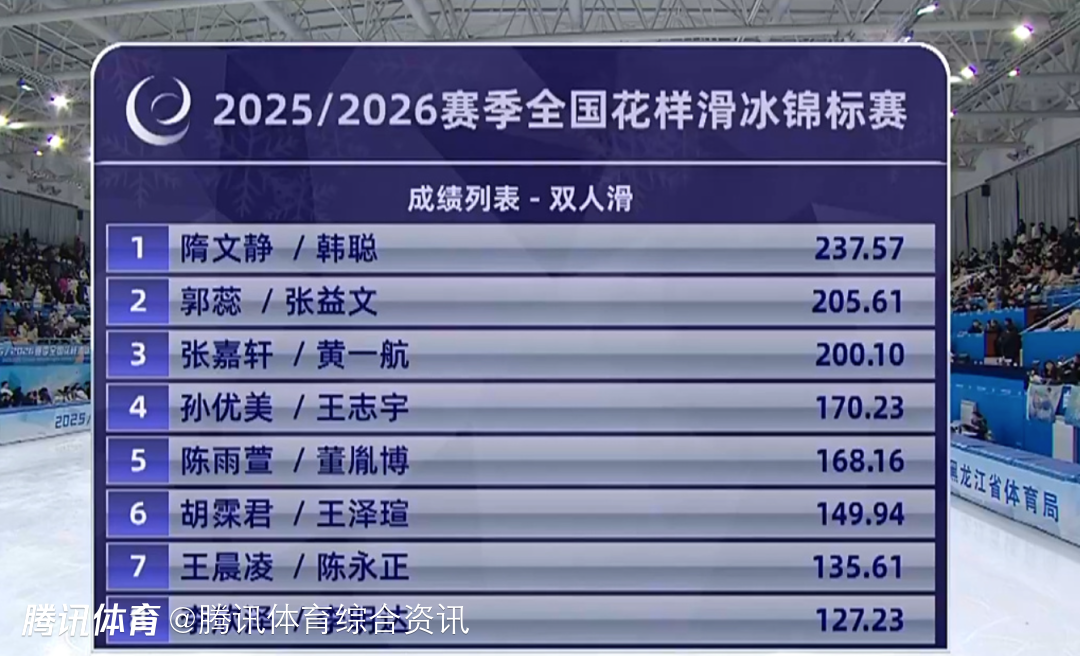 北京时间12月27日,全国花样滑冰锦标赛双人滑自由滑比赛,隋文静/韩聪自由滑得分151.60分,总分237.57分夺得冠军,这也是他俩复出后,首次国内大赛夺冠。郭蕊/张益文总分205.61获得亚军,张嘉轩/黄一航总分200.10分排名第三。