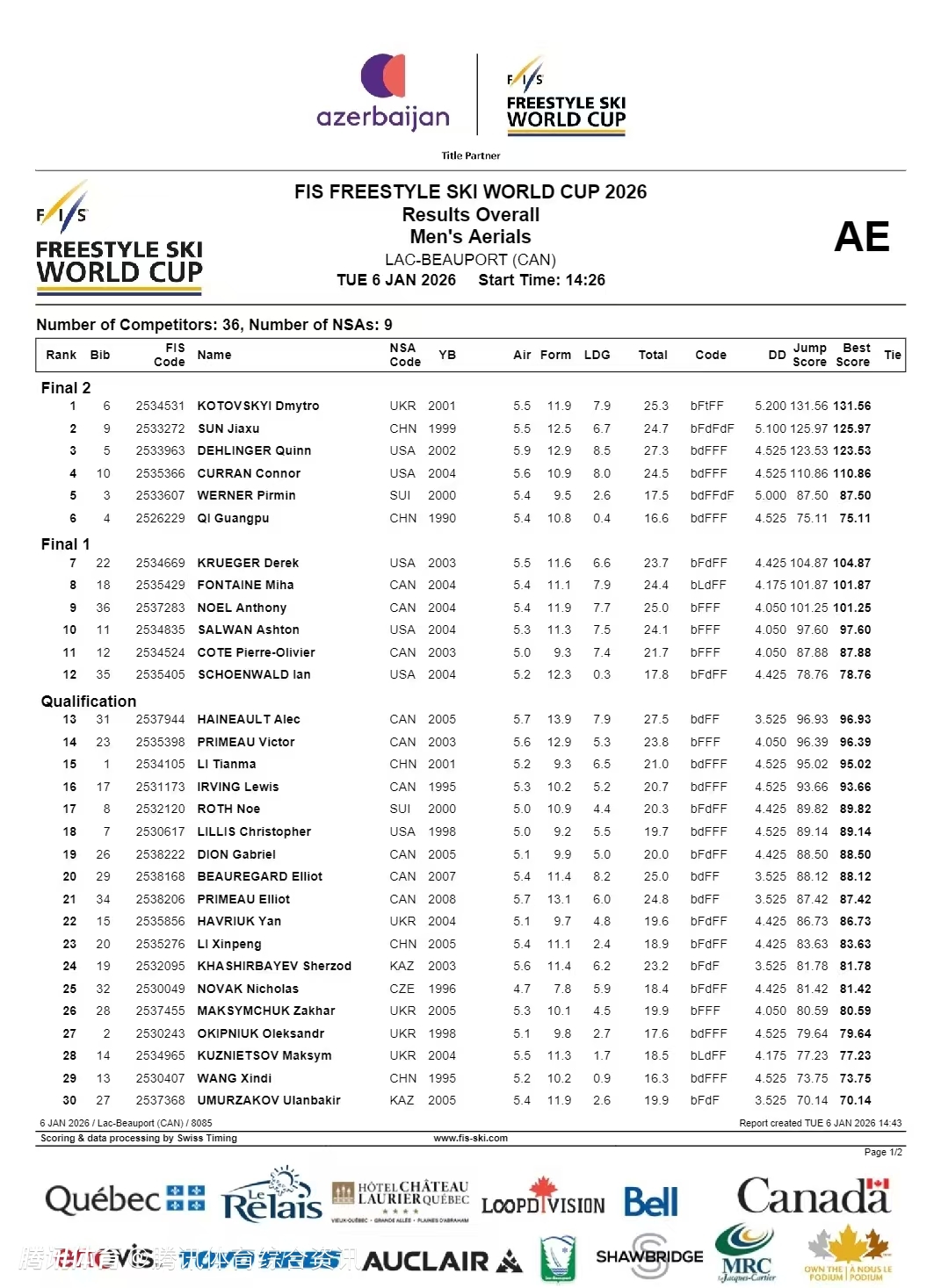 北京时间1月日7日,自由式滑雪空中技巧世界杯加拿大博波尔湖站(第一次)比赛结束,中国选手孙佳旭以125.97分夺得男子组亚军,奥运冠军齐广璞落地失败名列第六。乌克兰科托夫斯基和美国德林格尔分获冠军和季军,成绩分别为131.56分和123.53分。