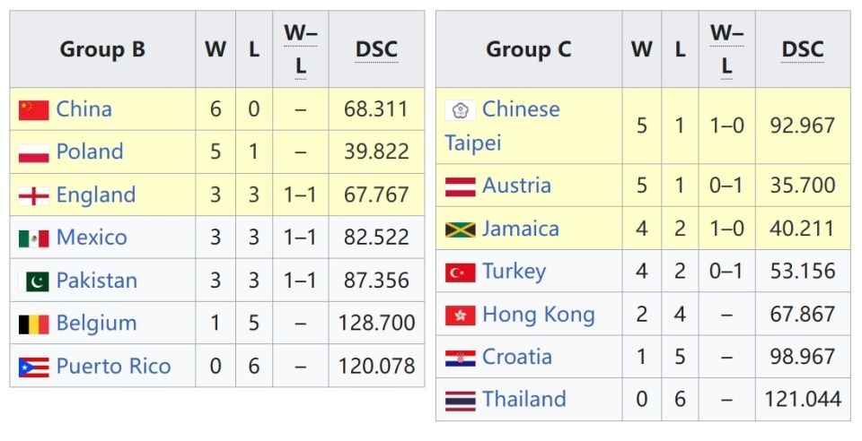 而C组五胜一负排在第1的中国台北队,则恰好DSC位列第五惨遭降级,需要与B组第三的英格兰队进行淘汰赛,胜者将与中国队角逐一个世锦赛席位。