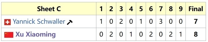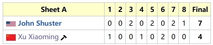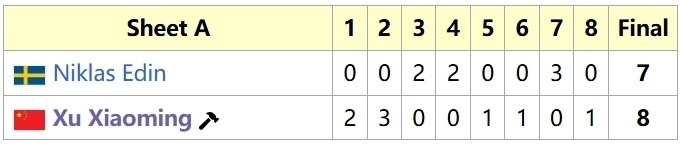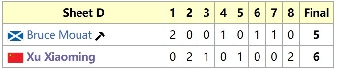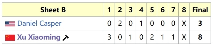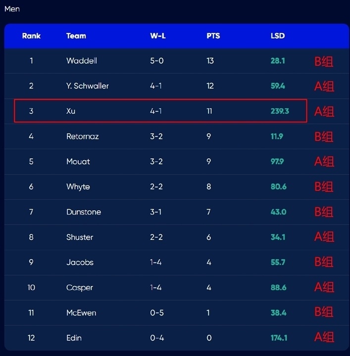 就这样,两组成绩合并,徐晓明队以4胜1负排在第三位(不考虑胜负关系,只看胜负场以及DSC),率领中国男子冰壶首次晋级大满贯季后赛。