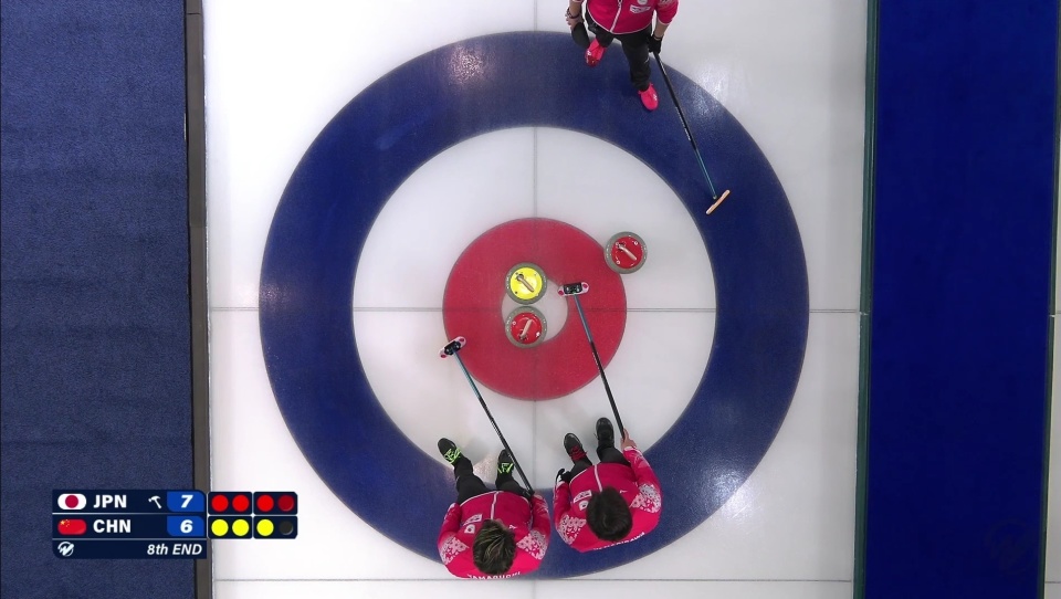 第六局:又来到先手局,中国队尝试双中区占位,并尽量往大本营送壶,不过从三垒开始,这些壶都被日本清理;