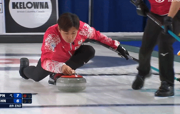 第七局:三分优势在手的日本队优先展开空翻策略,同时还尽可能找机会往营中送壶;