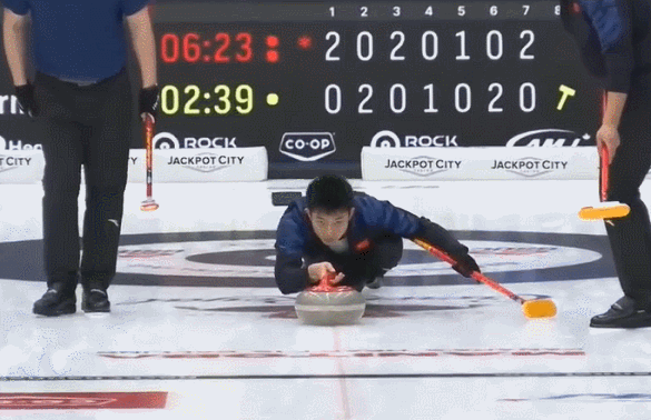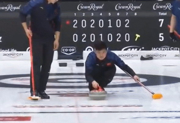 雷托纳兹虽然解决掉中国红壶,徐晓明补壶;雷托纳兹最后一投形成了关联,只能尽力制造难度...徐晓明稳健投壶入营,中国队拿到2分,以7-5领先。
