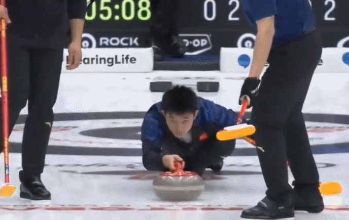 之后中国队叫了暂停,经过与教练在击打还是旋壶入营的商讨后,果断选择前者。