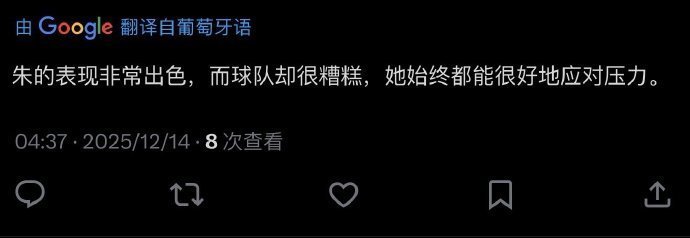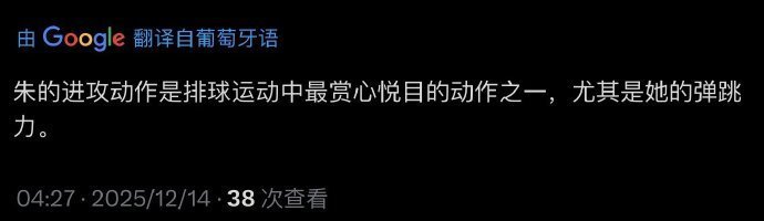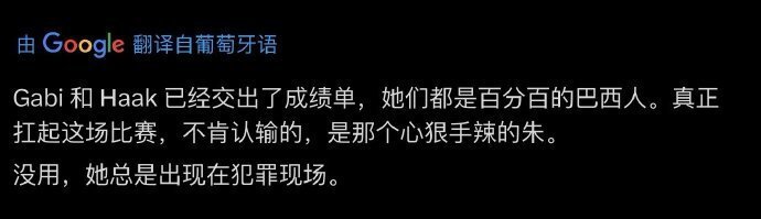 还有不少巴西球迷直言朱婷才是科内利亚诺真正的核心:“朱婷的表现非常出色,在球队状态最糟糕时,只有她能始终很好应对压力!”:“虽然加比和哈克得分更高,但真正扛起这场比赛并且不肯认输的,只有那个心狠手辣的朱婷!”;“朱婷独自一人扛起科内利亚诺这艘巨舰,避免球队提前出局的尴尬!”